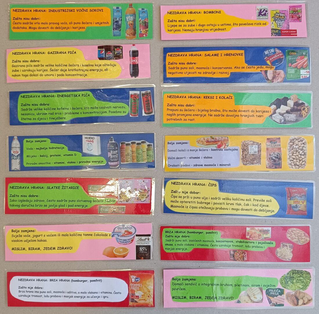 „Hrana nije neprijatelj niti nagrada – ona je naš saveznik. Daje nam energiju za učenje, sport, koncentraciju i dobro raspoloženje. Ne trebate jesti ‘savršeno’, nego raznoliko, redovito i svjesno. Hranu ne treba dijeliti na zdravu i nezdravu, nego na nutritivno bogatu i nutritivno siromašnu. Nutritivno bogata hrana daje puno korisnih tvari u odnosu na količinu energije (kalorija). Sadrži vitamine, minerale, vlakna, kvalitetne proteine i zdrave masti. Primjeri su voće, povrće, mahunarke (leća, slanutak, grah), orašasti plodovi, jaja, riba, meso, jogurt i cjelovite žitarice. Nutritivno siromašna hrana daje puno energije (šećera, masti ili soli), ali malo vitamina, minerala i vlakana. Primjeri su slatkiši, pića s dodanim šećerom ili sladilima, čips, pekarski proizvodi od bijelog brašna i brza hrana. To ne znači da je neka hrana ‘zabranjena’, ali je važno koliko često i u kojoj količini je konzumiramo.“